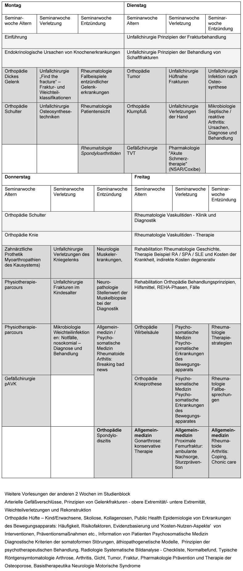 Wochenweise werden Schwerpunkte auf Altern des Bewegungsapparates, Unfälle und Entzündungen gelegt. Der Unterricht baut auf Fälle auf, die zu Wochenbeginn an Kleingruppen initiiert werden. Neben den Kernfächern werden wichtige Aspekte durch z.B. Humangenetik, Neuropathologie, Mikrobiologie, Psychosomatik, Epidemiologie in Seminaren vermittelt und zum Wochenabschluss erfolgt eine Zusammenfassung unter allgemeinmedizinischer Sichtweise (siehe Abbildung 3 [Abb. 3]).