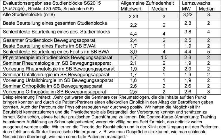 Ergebnis: Die interprofessionelle Lehre wurde vor 2 Jahren für 420 Studierende im 1. Studienjahr und 360 Studierende im 4. Studienjahr sowie 40 angehende Physiotherapeuten im 1. und 3. Ausbildungsjahr eingeführt und bis jetzt fortgesetzt. Die dokumentierte Lehr- und Lernzufriedenheit ist hoch und liegt deutlich über dem Durchschnitt aller Lehrbereiche (Zufriedenheit RMD Note 2,4, Durchschnitt aller 3,3) . Die Bestehensquote der Abschlussprüfungen liegt bei 94%. Alle Befragten befürworten die Fortsetzung der interprofessionellen Lehre.