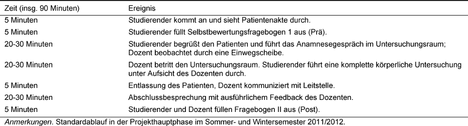 Der Patient wird bei seiner Ankunft vom Studierenden und vom Dozenten begrüßt, der erneut den Ablauf erläutert, die Einverständnis des Patienten noch einmal sicherstellt und anschließend den Raum verlässt. Der Studierende erhebt nun eigenständig die Anamnese, während der Dozent ihn durch eine Einwegscheibe beobachtet, Notizen zu seinem Verhalten macht und diagnostische Informationen in der Akte festhält. Nach Abschluss der Anamnese, typischerweise nach ca. 20 Minuten, betritt der Dozent erneut den Untersuchungsraum. Wenn nötig, ergänzt er die Anamnese mit eigenen Fragen. Da die Patienten erstvorstellig und die Fälle daher potenziell herausfordernd sind, können sich Studierende bei Unsicherheiten jederzeit hilfesuchend an den Dozenten wenden. Eigeninitiativ greift der Dozent nur bei bis dahin wenig richtungsweisender Anamnese ein, beim Überschreiten eines Zeitlimits von 45 Minuten sowie bei gravierenden Missverständnissen oder drohenden Konflikten, die der Studierende anscheinend nicht alleine auflösen kann.