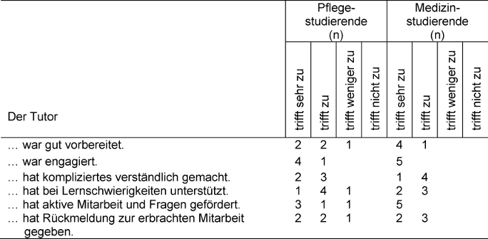 Dies ist dem Tutor u.a. durch die Rückmeldung zur erbrachten Mitarbeit der einzelnen Studierenden gelungen (siehe Tabelle 2 [Tab. 2]).