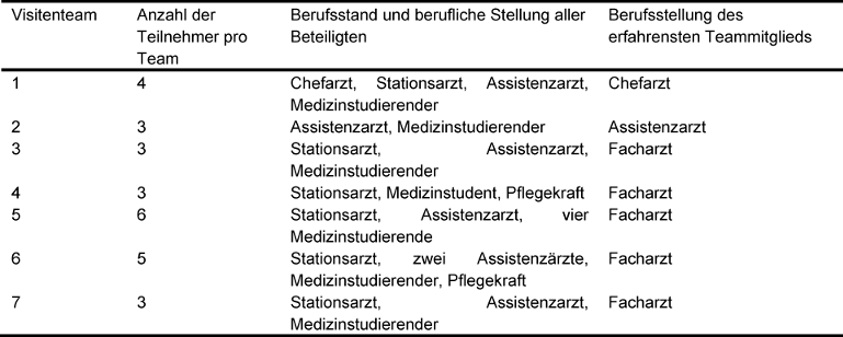 Sieben Visitenteams unterschiedlicherSpezialisierungen der Inneren Medizin unseres Universitätsklinikums nahmen an den Videoaufzeichnungen teil (siehe Tabelle 1 [Tab. 1]). Um ökologische Validität zu gewährleisten, entsprachen die Zusammensetzung des Teams und die Anzahl der Teammitglieder dem jeweils aktuellen Dienstplan und dem üblichen Prozedere. Einige Visiten wurden ausschließlich von AssistenzärztInnen durchgeführt, während bei anderen auch Stations- bzw. OberärztInnen anwesend waren. An den Visiten auf zwei Stationen nahm darüber hinaus Pflegepersonal teil. In Einklang mit der Deklaration von Helsinki basierte die Teilnahme an den Videoaufzeichnungen auf Freiwilligkeit und die Ethikkommission der Medizinischen Fakultät genehmigte die Studie.