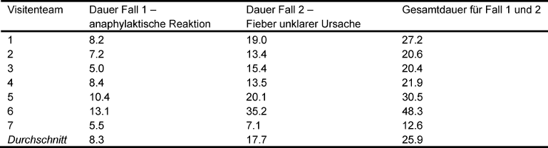 Hinsichtlich der Generalisierbarkeit der Checkliste, ware eine multi-institutionelle Validierung im Rahmen realer Visiten wünschenswert. Zur wissenschaftlichen Bewertung der Checkliste war jedoch eine Standardisierung von Visitenszenarien erforderlich. Um die externe Validität der Checkliste zu bewerten, haben wir uns entschieden, echte Visiten standardisierter Patientenfälle in unterschiedlichen Kliniken, Stationen unterschiedlicher Spezialisierungen und verschiedenen Visitenteams zu videographieren. Einen Überblick über die Dauer der Videos zeigt Tabelle 2 [Tab. 2].