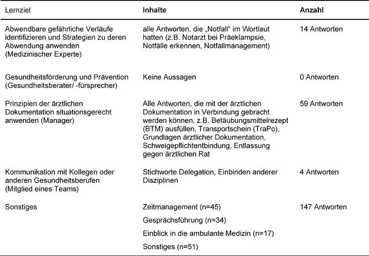 Die Auswertung der One-Minute-Paper erfolgte durch die Kategorisierung der Einträge in die vier Lernziele der „Ambulanzsimulation“. Die Zuordnung zu einem Lernziel erfolgte, wenn Schlüsselbegriffe aus der jeweiligen ärztlichen Rolle des NKLM genannt wurden, z.B. „Dokumentation“, was der Managerrolle entspricht. Die Auswertung erfolgte durch eine Person, Fragen der Zuordnung konnten bei Bedarf mit der Studienleitung diskutiert werden.