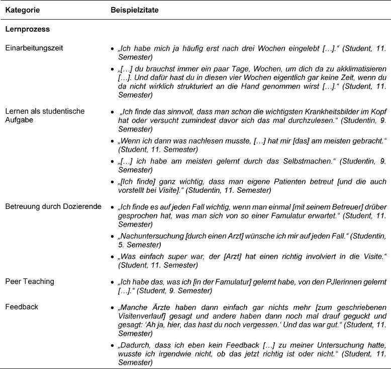 Mit Bezug zu den Lerninhalten wurden sieben Subkategorien identifiziert (siehe Tabelle 3 [Tab. 3]). Am häufigsten wurde genannt, dass die Famulierenden das Berufsfeld und den Patientenwerdegang erleben möchten und sich selbst keine konkreten Lernziele im Sinne des SOL setzen. Den Studierenden ist außerdem wichtig, praktische Basisfertigkeiten zu erlernen und selbststrukturiert zu üben, ebenso wie pflegerische Basisfertigkeiten, die offenbar im Pflegepraktikum nicht oder nicht ausreichend gelernt, aber meist in der Famulatur vorausgesetzt werden. Die Studierenden haben außerdem die Erwartung, in einer Famulatur an den Prozess der klinischen Entscheidungsfindung herangeführt zu werden und professionelles Verhalten zu lernen, um dieses dann im SOL üben zu können. Für den Lernprozess konnten fünf Subkategorien herausgearbeitet werden (siehe Tabelle 4 [Tab. 4]). Wichtig ist, dass zu Beginn der Famulatur eine Einarbeitungszeit eingeplant ist, um in den Prozess des SOL hineinzukommen. Das Lernen selbst wird als studentische Aufgabe gesehen, wobei gezielte thematische Vorbereitung, kontinuierliches Üben und Übernahme von Verantwortung als wichtige Aspekte für die Förderung des SOL genannt wurden. Sowohl Betreuung durch Dozierende als auch durch Peers (z.B. PJ-Studierende) sowie kontinuierliches Feedback waren den Studierenden wichtig, um ihr SOL während der Famulatur gut strukturieren zu können.