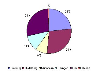 Bei der Fragebogenerhebung wurden insgesamt 1433 Studenten der Medizinischen Fakultäten in Baden-Württemberg befragt. Mit jeweils 28% kamen die größten Anteile der Befragten aus Heidelberg und Ulm (siehe Abbildung 1 [Abb. 1]).