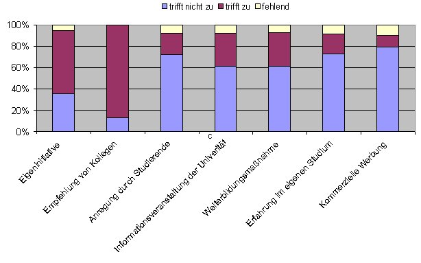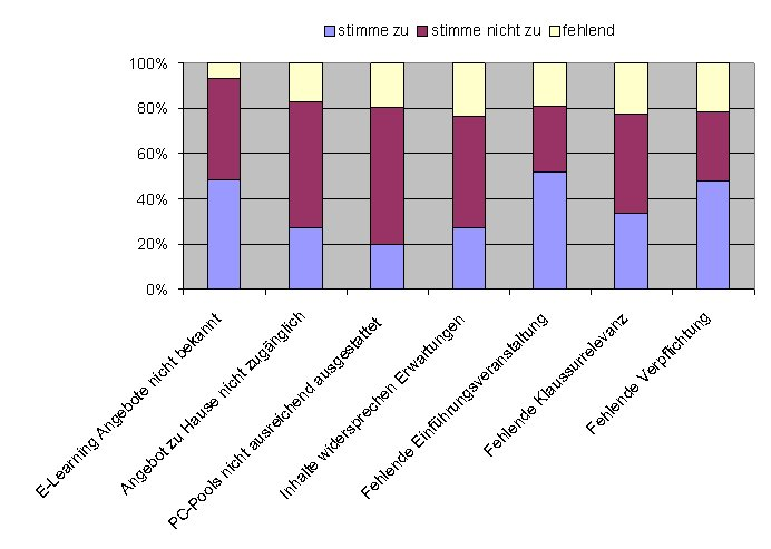 Der Hauptgrund gegen den Einsatz von E-Learning, den die meisten Befragten nannten, ist die fehlende Information über E-Learning. Bei der Frage nach dem technischen Wissen, bzw. der technischen Ausstattung ergibt sich eine nahezu exakt hälftige Verteilung der gegebenen Antworten auf die Möglichkeiten "trifft zu" und "trifft nicht zu". An letzter Stelle als Grund gegen die Nutzung von E-Learning steht das fehlende Interesse. Hierbei ist sich etwa die Hälfte der Lehrenden einig, dass dies nicht zutrifft. Auch die Akzeptanz bei den Studenten stufen die Lehrenden als recht hoch ein, über 60% der Befragten geben an, die mangelnde Akzeptanz bei Studierenden sei kein Grund, der gegen den Einsatz von E-Learning spricht. Etwa 15% der Lehrenden gaben an, diese Frage nicht beurteilen zu können.