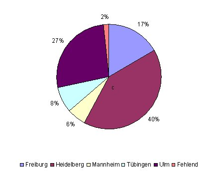 Die größten Anteile der Bögen kommen, wie auch dem Schaubild (siehe Abbildung 17 [Abb. 17]) zu entnehmen ist, aus Heidelberg und Ulm.
