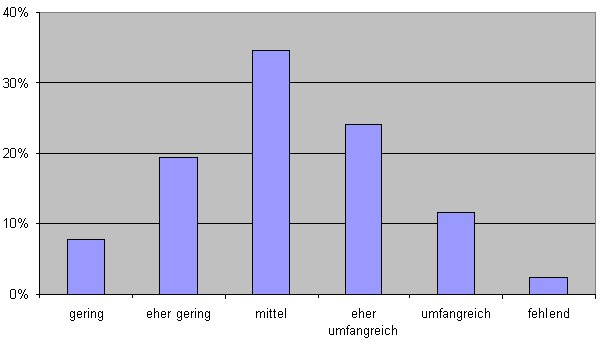 Die prozentuale Verteilung zeigt, dass über die Hälfte aller Befragten ihre Kenntnisse als "umfangreich" und immer noch fast ein Drittel als "mittel" einstufen. Ein kleiner Prozentsatz (6,8%) empfindet die eigenen Kenntnisse als "gering". Diese Frage wurde von 2,79% der Probanden nicht beantwortet.