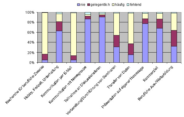 Es zeichnet sich bei der wöchentlichen Nutzung des Internets ab, dass die meiste Zeit im Internet für die berufliche Forschung verwandt wird. Es schließen sich die Nutzung für die Bereche "Lehre" und "Klinik" an. Zwischen 3% (beruflich, Forschung) und 10% (beruflich, Klinik) nutzen das Internet nie für angegebene Zwecke.