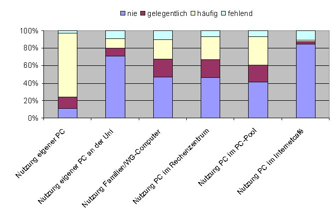 Am häufigsten wird der eigene PC zu Hause genutzt. Die an der Universität bereit gestellten Computer in Rechenzentren und PC-Pools werden von etwas mehr als 20% der Studierenden genutzt. Am wenigsten Nutzung erfahren PCs kommerzieller Anbieter. Fast ebenso wenige nutzen den eigenen PC (via W-Lan) an der Universität.