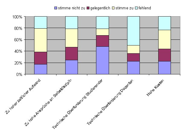 Etwa 60% der Befragten erwarten eine technische Überforderung der Dozenten. Im direkten Vergleich mit der technischen Überforderung der Studenten, die von 40% erwartet wird, schätzen die Lehrenden die technischen Fertigkeiten der Dozenten als geringer ein als diese ihrer Studenten. Nachteilen wie hoher Zeitaufwand, Ansprüche an Selbstdisziplin und hohe Kosten stimmen etwas über die Hälfte aller Befragten zu.