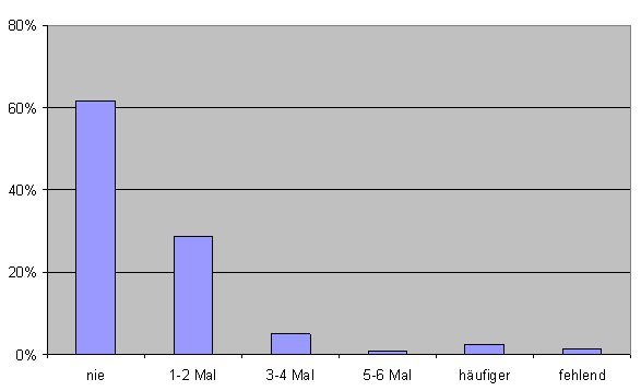 Insgesamt etwa 80% der Befragten verfügen über einen privaten Internetzugang. Immerhin noch etwa 70% haben in der Universität Zugang zum Internet. 12% verfügen über einen Internetzugang in der Klinik. Knapp 2% verfügen über keinen Internetzugang, das sind 23 Befragte.