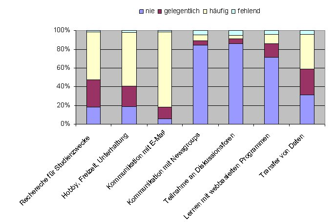 63,6% aller Befragten gaben an, zwischen einer und neun Stunden wöchentlich das Internet für private Zwecke zu nutzen. Immerhin noch 18,6 % surfen 10-19 Stunden pro Woche für private Zwecke. Für studienbezogenes Surfen verwenden 70% der Studierenden nur 1-9 Stunden, und lediglich 15,2% 10-19 Stunden. Da 95% der Studierenden bei der privaten Nutzung in den Bereichen von 1-49 Stunden liegen, bei der studienbezogenen Nutzung allerdings 95% im Bereich 1-39, kann festgestellt werden, dass die Dauer der privaten Nutzung über der Dauer der studienbezogenen Nutzung liegt. 2,7% gaben sogar an, das Internet nie für studienbezogene Zwecke zu nutzen.