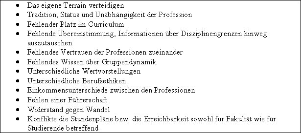 So ermutigend und plausibel all diese Überlegungen auch wirken, sie sollten bei curricularen Überlegungen aber auch davor schützen, die Barrieren, die einem solchen Lernansatz aus der Kooperationserfahrung heraus entgegen stehen könnten, nicht außer acht zu lassen, wie Gardner [6] in ihrer Zusammenstellung (siehe Tabelle 3 [Tab. 3]) deutlich werden lassen.