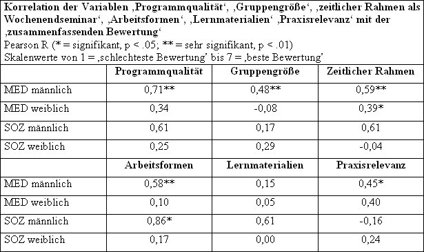 Das dabei sichtbar werdende Bild weist eine besondere Auffälligkeit auf: Das einzige Kollektiv, in dem mehrere signifikante Zusammenhänge zwischen der Gesamtbewertung und Einzelbewertungen sichtbar werden, ist das der männlichen MES. Dies betrifft, das Seminarprogramm, die Gruppengröße und die Arbeitsformen im Seminar. Die beiden Teilkollektive der MES sind es auch, bei denen der zeitliche Rahmen als Wochenendseminar einen signifikanten Zusammenhang mit der Gesamtbewertung ausweist.