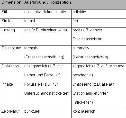 Die Idee des Portfolio ist dem Studium der bildenden Künste entlehnt, wo in Form sog. "Mappen" eine aussagekräftige und zielgerichtete (also nicht willkürlich zusammengestellte) Sammlung von Belegen für einen absolvierten Lernprozess zusammengestellt wird, aus denen die Bemühungen, der Lernerfolg und v.a. der Lernfortschritt erkennbar werden. Bekannter allerdings ist der Begriff durch den Verwendungszusammenhang im Umfeld wirtschaftswissenschaftlichen Expertentums (eine kurze Erläuterung findet sich z.B. in [15]). Diese Belege orientieren sich somit an Lehr- und Lernzielen und können nach Friedman [13] unterschiedliche Inhalte umfassen: Aufsätze bzw. Hausarbeiten, Berichte und Projektbeschreibungen, Beurteilungen der praktischen Fertigkeiten (z.B. im Rahmen der Famulatur), (Video-) Protokolle von Gesprächen mit (Schauspieler-) Patienten, Dokumentation praktischer Tätigkeiten ("Logbuch"), erhobene Anamnesen, durch Ausbilder ausgestellte Zeugnisse etc.. Es ist zu beachten, dass ein Portfolio mit unterschiedlicher Zielsetzung erstellt werden kann - über die sich natürlich die/der Lernende sowie die/der "Beurteilende" verständigen müssen [5]. Der Zweck der Portfolioarbeit bestimmt maßgeblich seinen Inhalt, die Auswahlprozesse und die Interaktion zwischen Lehrenden und Lernenden. Nach Tomkinson [40] werden dabei verschiedene Dimensionen (Stil, Struktur, Umfang, Zielsetzung, Diskretion, Inhalte und Zeitverlauf) unterschieden, die sehr unterschiedliche Ausprägungen annehmen können (siehe Tabelle 1 [Tab. 1]). So ist das Portfolio primär formativ (zum Unterschied formativ / summativ siehe Abbildung 1 [Abb. 1]), also der Rückmeldung des Lernfortschrittes dienend, mit der Absicht, Stärken und Schwächen aufzuzeigen, um letztere ggf. gezielt zu beheben. Andererseits kann das Portfolio summativ zum Leistungsnachweis herangezogen werden, um z.B. das Erreichen von Minimalanforderungen sicher zu stellen. Unabhängig von der verfolgten Zielsetzung muss das Portfolio dem Lernprozess entsprechend konzipiert sein, den es begleitend dokumentieren soll. Generell soll das Portfolio folgende zentrale Aspekte beinhalten (nach [5]):