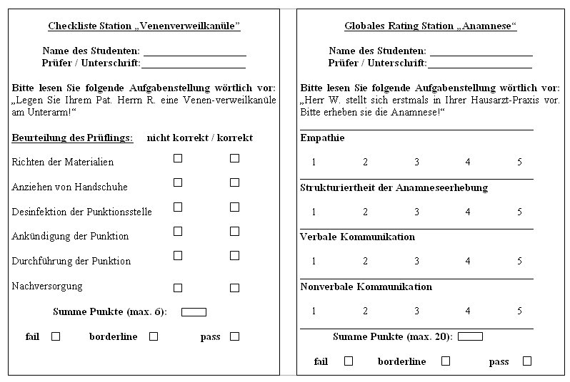 An den Stationen selbst wurde zuerst der Namen der Studenten erfragt und dieser auf der Checkliste notiert. Mit dem ersten Signalton wurde die Aufgabenstellung vom Prüfer wörtlich vorgelesen. Diese stand den Studenten zusätzlich in schriftlicher Version an den einzelnen Prüfungsstationen zur Verfügung. Mit dem zweiten Signalton endete die Prüfungszeit und die erreichte Gesamtsumme wurde vom Prüfer notiert. Der Medizinstudent erhielt ein kurzes Feedback (ca. 30s) zu seiner Prüfungsleistung ohne die Nennung des erreichten Punktwertes, bevor er zur nächsten Station gebeten wurde. Anschließend wurde die Checkliste vom Prüfer unterschrieben und in die vorgesehene Ablage gelegt.