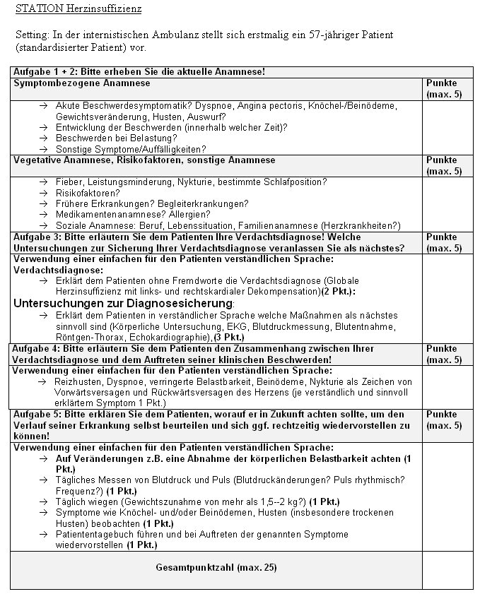 Die einzelnen Prüfungsstationen des 12-Stationen-OSCE wurden von Vertretern der jeweiligen internistischen Teildisziplin in Übereinstimmung mit dem entworfenen Blueprint entwickelt. Als Grundlage diente ein definiertes Checklistenformat mit einem modifizierten Rating mit fünf Teilaufgaben, bei denen jeweils 5 Punkte zu erzielen waren. Insgesamt konnte somit eine Maximalpunktzahl von 25 pro Prüfungsstation erreicht werden. Das Checklistenformat beinhaltet sowohl Anteile des Checklisten-Ratings als auch des globalen Ratings: So werden z.B. für die Teilaufgabe 1 und 2 der Checkliste in Abbildung 2 [Abb. 2] nur die maximal zu erreichende Punktzahl vorgegeben, so dass der Gesamteindruck des Prüfers bezüglich der Gesprächsführung und Empathie mit in die globale Bewertung einfließen kann.