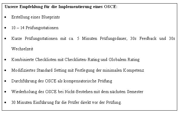 Der OSCE stellt eine Prüfungsmethode dar, die sich sehr gut zur Prüfung von wesentlichen klinisch-praktischen und kommunikativen Kompetenzen zukünftiger Ärzte eignet. Vor allem in Folge der Novellierung der Approbationsordnung für Ärzte [3] wird die Durchführung einer klinisch-praktischen Prüfung zunehmend an Bedeutung gewinnen. Allerdings ist die OSCE-Prüfung bei den Studentenzahlen deutscher Fakultäten mit organisatorischen und logistischen Herausforderungen verknüpft. Das Anliegen der vorliegenden Arbeit war eine zeit- und ressourcenschonende Implementierung an anderen Fakultäten in Hinblick auf Konzeption, Durchführung und Notenvergabe zu erleichtern.