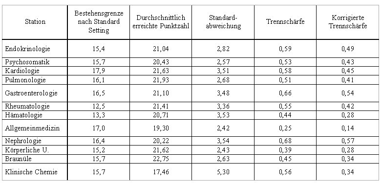 Die Bestehensgrenze für die einzelnen OSCE-Stationen wird aus Tabelle 3 [Tab. 3] ersichtlich. Die Mittelwertbildung über die 12 Stationen ergab für den OSCE des WS 2004 / 2005 eine Bestehensgrenze von 188 Punkten.