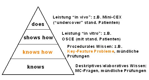 Mit der neuen Ärztlichen Approbationsordnung [4] wird den Fakultäten die benotete Überprüfung der Leistungsfähigkeit der Studierenden bzgl. ihres deklarativen und prozeduralen Wissens anvertraut. In den letzten Jahren sind in der Medizin verschiedene Prüfungstypen entstanden, mit denen prozedurales Wissen, also klinische Fertigkeiten und Kompetenzen, geprüft werden kann. Beispiele hierfür sind MiniCEX- oder OSCE-Prüfungen, wie sie beispielsweise in Heidelberg eingesetzt werden [12], [13]. Ein weiterer Prüfungstyp sind Key-Feature (KF)-Prüfungen.