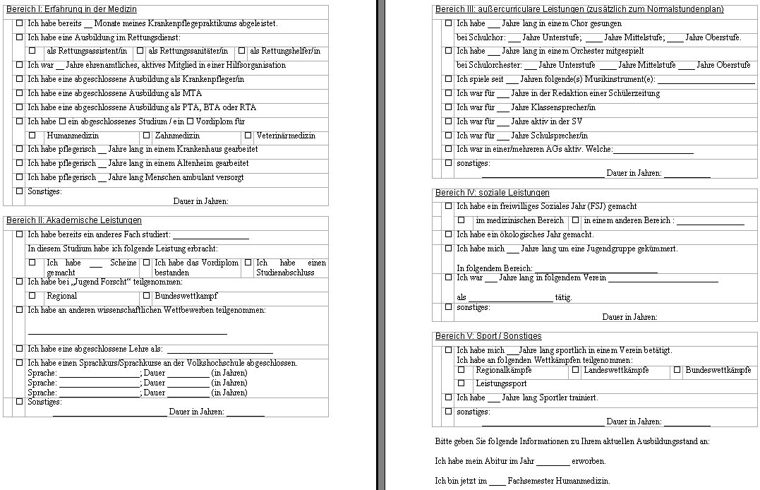 Soft skills sind für den Patientenkontakt wesentlich und sollten bereits bei Studienanfängern gut ausgebildet sein. Die Berücksichtigung von Soft skills bei der Bewerberauswahl wird immer wieder gefordert; bisher fehlen im deutschsprachigen Raum jedoch Methoden zur effizienten Erfassung von Parametern, die für soft skills prognostisch valide sind. Im Rahmen einer Vorstudie haben wir versucht, nichtschulische belegbare Aktivitäten zu erheben, die in einer nachfolgenden Studie auf ihre prognostische Eignung für den Studienverlauf weiter untersucht werden könnten. Die im Fragebogen (siehe Abbildung 1 [Abb. 1]) enthaltenen Items wurden selektioniert, um häufige, belegbare und eventuell quantifizierbare Aktivitäten zu erheben. Nicht objektiv belegbare (z.B. Interesse am Fach), nicht objektivierbare oder trainierbare Items, sowie Parameter, die eine Präsenztestung erfordern (Motivationsfragebogen), wurden nicht erhoben.