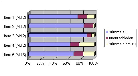 Studentische Evaluation: Im 10. Semester lag die Rücklaufquote der Fragebögen im Sommersemester 2006 bei 66 % (n = 44). Die Akzeptanz des neuen Kurses war hoch. Bei 17 der 20 Items lag der Median (Md) zwischen 1 und 3. Beispielhaft sind im Folgenden fünf Evaluationsergebnisse dargestellt (siehe Abbildung 2 [Abb. 2]).