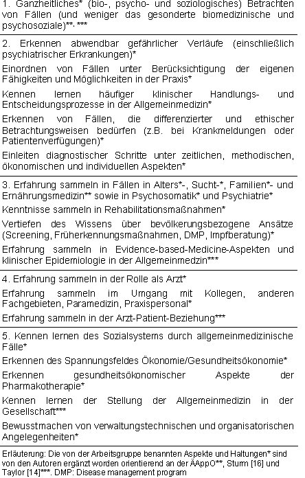 Hintergrund: Der Gesetzgeber hat seit Oktober 2003 einen Teil der medizinischen Ausbildung im Praktischen Jahr (PJ) an die Allgemeinmedizin delegiert. An unserer Fakultät absolvieren seit 2006 Studierende das PJ in Allgemeinmedizin. Um einer wissenschaftlichen, praxis- und patientenbezogenen sowie fächerübergreifenden Ausbildung nachzukommen, bedarf es der Orientierung an Lernzielen. Diese existieren weltweit für allgemeinmedizinische Curricula und sind variabel und abhängig vom Ausbildungsstand und den Bedürfnissen vor Ort. Speziell für das PJ in Allgemeinmedizin hingegen sind bislang keine systematisch erarbeiteten Lernziele veröffentlicht.