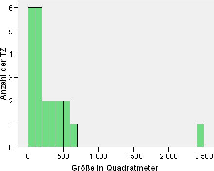 Auch in der Anzahl und Größe der Räumlichkeiten bestanden erhebliche Unterschiede (siehe Abbildung 1 [Abb. 1]). Das größte TZ verfügte über 31 Räume mit insgesamt 2500 Quadratmetern, 6 TZ hingegen besaßen eine Fläche von unter 100 Quadratmetern. 50 Prozent der TZ waren zwischen 100 und 420 Quadratmetern groß, verteilt auf 3 bis 14 Räume. In 18 Fällen waren diese Räume zusammenhängend, in 2 Fällen örtlich getrennt.