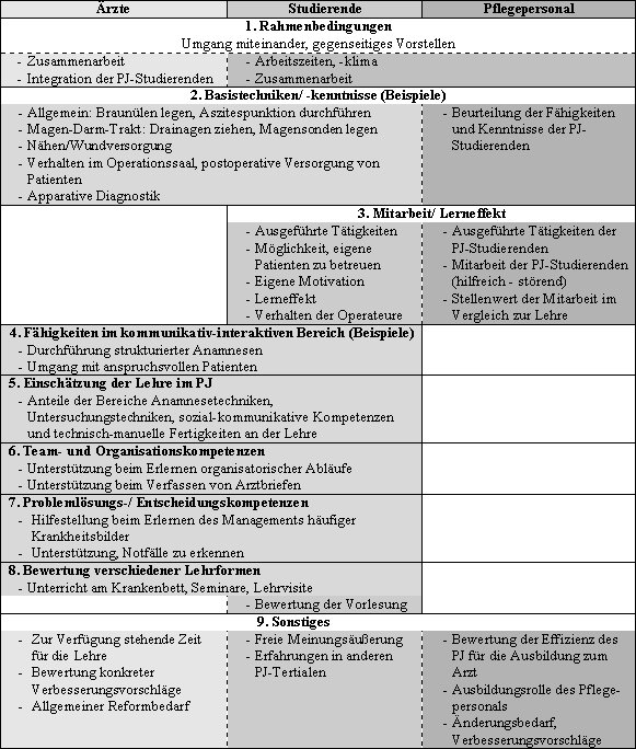 Einige Kritikpunkte bzw. Verbesserungsvorschläge wurden jeweils von allen drei (!) Berufsgruppen genannt. So waren viele Befragte einhellig der Meinung, dass die derzeitige Ausbildung während des Praktischen Jahres nicht ausreichte, um die Studierenden auf den späteren Beruf als Arzt vorzubereiten. Ebenso wurde bemängelt, dass für die Ausbildung im PJ klare Richtlinien und Lernziele fehlten und nicht ausreichend definiert sei, welche Aufgaben PJ-Studierende an ihren Einsatzorten tatsächlich haben. Viele Befragte aus allen drei Gruppen hielten es im Sinne einer praxisnahen Ausbildung für wünschenswert, dass die Studierenden in der Zeit auf Station kontinuierlich eigene Patienten betreuen sollten.
