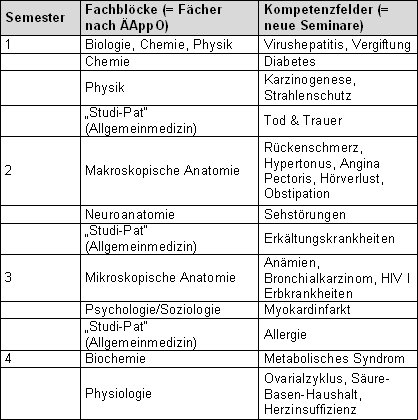 Öfter jedoch werden diese „neuen“ Seminare in bereits nach Anlage 1 ÄAppO bestehende Seminare und/oder Praktika integriert (insbesondere „Praktikum der Einführung in die Klinische Medizin“ oder auch den Seminaren Anatomie, Biochemie und Physiologie jeweils mit klinischem Bezug sowie der Seminare der Psychologie und Soziologie). Die sich hieran anschließende Frage, ob die Integration zu Absenkungen der Deputatstunden dieser Unterrichtseinheiten geführt hat, kann hier nicht beantwortet werden.