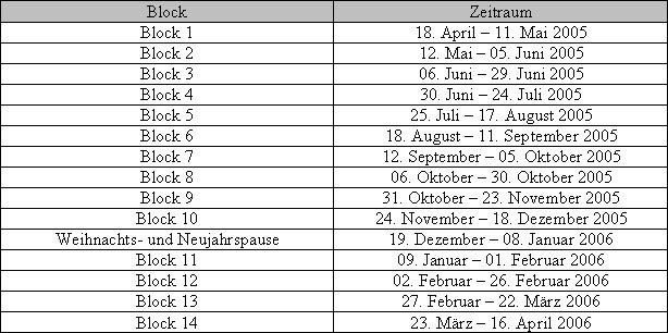 - Zeitliche Präferenz (möglichst viele zusammenhängende Blöcke, eher Lücken zwischen den Blöcken)
