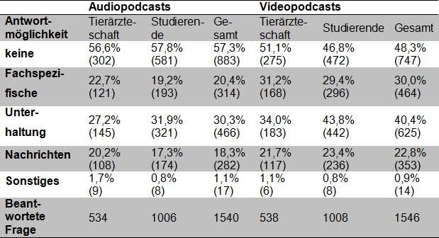 Das Verhältnis bei den Videopodcasts ist ähnlich: Fachspezifische (30,0%), Nachrichten- (22,8%) und Unterhaltungs-Podcasts (40,4%). Tierärzteschaft und Studierende weisen in der Nutzung von Podcasts und Videopodcasts keine signifikanten Unterschiede auf.