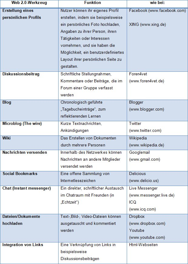 In dieser Arbeit sollte untersucht werden, wie die Akzeptanz bei deutschen Tierärzten, Dozierenden und Studierenden der Veterinärmedizin sowie E-Learning-Beauftragten für ein fachspezifisches Netzwerk ist, welche Anforderungen durch die Nutzer an soziale online-Netzwerke gestellt werden, wie der Umgang mit Web 2.0-Werkzeugen