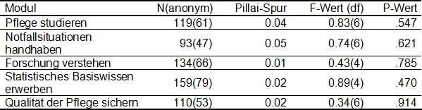 Während des Erhebungszeitraums wurden insgesamt 27 Module evaluiert. Von der Untersuchung ausgeschlossen waren alle Praxis- und Kommunikationsmodule sowie die Module des Clinical Assessments, da diese durch andere Fragebogen evaluiert wurden. Die Studienverantwortlichen wählten von den 27 Modulen für die Untersuchung fünf Module aus, die den vielfältigen Bachelorstudiengang Pflege angemessen abbilden: „Pflege studieren (Einführungsmodul)“, „Notfallsituationen handhaben“, „Forschung verstehen“, „Statistisches Basiswissen erwerben“ und „Qualität der Pflege sichern“. Insgesamt flossen damit 615 ausgefüllte Fragebogen, davon 306 in anonymer Form, in die Untersuchung ein.