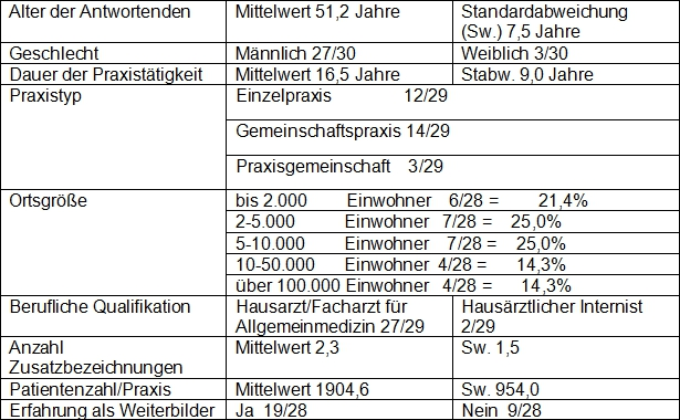 30 Hausärzte aus dem allgemeinmedizinischen Listserver sowie den Sektionen Fortbildung und Weiterbildung der DEGAM beteiligten sich und beantworteten neben soziodemographischen (Alter, Geschlecht, Dauer der Niederlassung, Größe der Ortschaft, formale Qualifikation, Praxisgröße) auch Fragen nach eigenen Zusatzqualifikationen, Erfahrungen als Weiterbilder, der Anzahl im Kriterienkatalog erreichter Punkte sowie der Einschätzung der Angemessenheit der daraus resultierenden Dauer einer Weiterbildungsbefugnis (siehe Tabelle 4 [Tab. 4]).