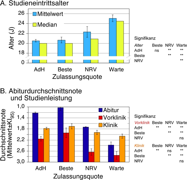 Die Studierenden der AdH- und Abiturbestenquote waren bei Studienbeginn durchschnittlich 20,5 Jahre, die Studierenden der NRV-Gruppe 22,3 Jahre alt. Die Studierenden der Wartezeitquote bildeten mit durchschnittlich 25 Jahren bei Studieneintritt eine deutlich ältere Gruppe (siehe Abbildung 1A [Abb. 1]).