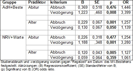 Für eine differenziertere Analyse wurde die Bedeutung der Abiturdurchschnittsnote und des Studieneintrittsalters für Studienabbruch und -verzögerung im vorklinischen Studienabschnitt in den zusammengefassten Zulassungsgruppen, AdH- + Abiturbestenquote, NRV-Gruppe + Wartezeitquote, getrennt untersucht (siehe Tabelle 2 [Tab. 2]). Die Abiturdurchschnittsnote hatte einen starken Einfluss auf die Wahrscheinlichkeit einer Studienverzögerung in beiden zusammengefassten Studierendengruppen (OR≥3,280), jedoch keinen signifikanten Einfluss auf den Studienabbruch. Das Studieneintrittsalter dagegen zeigte einen moderaten, aber signifikanten Einfluss auf beide Kriterien in der zusammengefassten Gruppe AdH- + Abiturbeste. In der zusammengefassten Gruppe NRV + Wartezeit beeinflusste das Studieneintrittsalter signifikant das Studienabbruchsverhalten, nicht jedoch die Studienverzögerung (siehe Tabelle 2 [Tab. 2]).