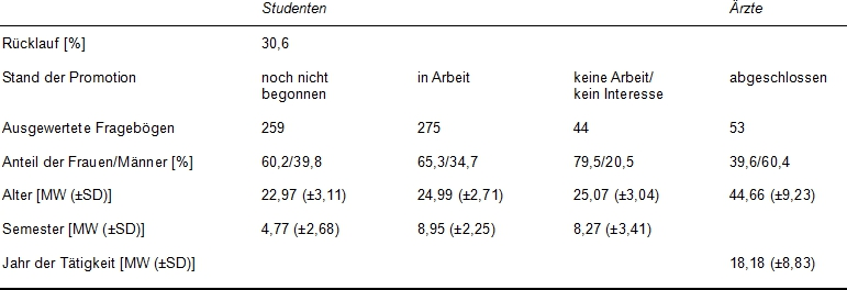 Die vorliegende Studie ermittelt im Rahmen einer Querschnittserhebung die Einstellung gegenüber der medizinischen Doktorarbeit und die Akzeptanz des derzeitigen Promotionsverfahrens bei Studierenden der Medizin und approbierten Ärzten. Auf Grund der hohen Promotionsrate unter den Absolventen eines Medizinstudiums und weil die Promotion in aller Regel studienbegleitend durchgeführt wird [1], [2], adressiert dieser Fragebogen vor allem Studierende, aus deren Reihen auch die meisten Rückläufe kamen. Approbierte Ärzte mit abgeschlossener Promotion stellen in unserer Umfrage nur 8,40% der Rückläufe. Während die Gruppen der Studierenden altersmäßig sehr homogen sind und von der Geschlechterverteilung auf keine unausgewogene Auswahl schließen lassen, ist die Gruppe der approbierten Ärzte signifikant älter und heterogener. Das stand einerseits zu erwarten, weil die Gruppe der approbierten Ärzte das komplette Berufsleben umschließt. Andererseits war es auch gewollt, um ein möglichst breites Spektrum an Erfahrungen mit dem persönlichen aus der Promotion gewonnenen Nutzen für den weiteren Lebensweg abzubilden. Gleichzeitig müssen wir davon ausgehen, dass besonders Ärzte an einem Universitätsklinikum eine einseitige Einstellung repräsentieren, da für diese Gruppe eine Doktorarbeit durchaus eine höhere Bedeutung haben könnte als für Ärzte, die nicht in einer akademischen Umgebung tätig sind.
