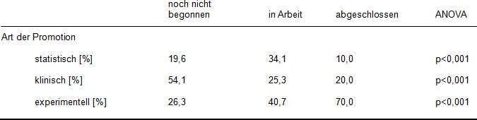 Beim Vergleich der Antworten von Studierenden und Ärzten vor Beginn, während oder nach Abschluss ihrer Promotion zeichnen sich verschiedene interessante und signifikante Unterschiede ab. Ein Unterschied betrifft die Art der Arbeit. Während sich 19,6% der Befragten vor Beginn ihrer Promotion eine statistische, 54,1% eine klinische und 26,3% eine experimentelle Arbeit vorstellen, führt tatsächlich die Mehrheit der Promovenden, nämlich 40,7% eine experimentelle, 25,3% eine klinische und 34,1% eine statistische Arbeit durch. Gegenüber der Gruppe, die schon abgeschlossen haben, ist der Unterschied noch größer: nur 10,0% haben eine statistische Arbeit, 20,0% eine klinische und ganze 70,0% eine experimentelle (siehe Tabelle 2 [Tab. 2]).