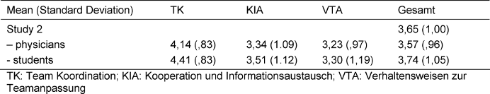 Ergebnisse: In Studie eins passte die faktorielle Struktur zu den theoretischen Komponenten, jedoch konnte Informationsaustausch und Teamkooperation nicht separiert werden. Die vorläufige Version zeigte ausreichende psychometrische Eigenschaften (Cronbach’s α=,75). In Studie zwei waren die ärztlichen Bewertungen reliabler als die studentischen Bewertungen. Weiterhin konnte eine enger Zusammenhang zwischen der Skala und klinischer Performanz als einem externen Kriterium (r=,64) gezeigt werden und die ausreichend hohen psychometrischen Eigenschaften konnten repliziert werden (Cronbach’s α=,78).