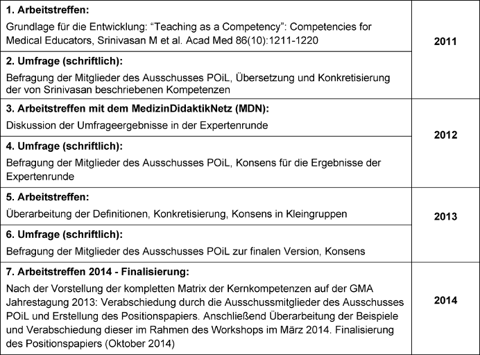 Im Rahmen des Workshops des Ausschusses POiL bei der GMA-Tagung in München 2011 wurde das von Srinivasan et al. [12] beschriebene nordamerikanische Modell vorgestellt und diente als Ausgangspunkt für die Entwicklung eines eigenen Kompetenzrahmens. Bei der Übersetzung wurde deutlich, dass die Kompetenzdefinitionen nicht 1:1 in den deutschen Sprachraum sowie den Kontext der deutschsprachigen medizinischen Ausbildung übertragen werden können, was eine Anpassung der Kompetenzen notwendig machte. Über die weiteren Schritte informiert Tabelle 1 [Tab. 1]. Das vollständige Manuskript wurde dem Vorstand der GMA im Oktober 2014 vorgelegt.