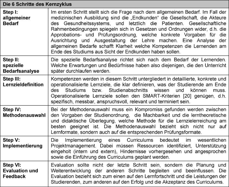 Die Strukturierung heutiger Curricula ist weniger input- oder prozessorientiert, als vielmehr kompetenz-, also outcome-orientiert [18], [19]. Vorzüge kompetenzorientierter Curricula bestehen darin, dass sie zum einen ein klares Steuerungsinstrument darstellen, welches den Maßstab für die Zielerreichung setzt und dabei hilft, einer Fragmentierung der Lehre entgegenzuwirken. Zum anderen erleichtern sie die Festlegung auf einzelne Lernziele und geben sowohl Studierenden als auch Lehrenden eine Perspektive auf das angestrebte Ergebnis. Zwei Modelle erscheinen uns hilfreich, um die einzelnen Schritte in der CE zu beschreiben: Kern et al. (siehe Tabelle 1 [Tab. 1]) beschreiben eine Methode bzw. Herangehensweise zur effektiven und langfristigen Etablierung einer strukturierten Bildungserfahrung („planned educational experience“ Kern S.1) in sechs Schritten [13]. Diese bezieht sich sowohl auf einzelne Seminare zu einem bestimmten Thema als auch auf mehrjährige Lehrveranstaltungen oder ganze Trainingsprogramme. Die einzelnen Schritte sind immer wieder zu durchlaufen bzw. beziehen sich aufeinander.