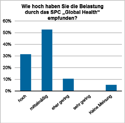- Im Hinblick auf die Übertragbarkeit des Gießener Modells auf andere Universitäten gilt der Grundsatz „think global - act local“: Die Struktur des SPC Global Health orientiert sich an den spezifischen lokalen Voraussetzungen in Gießen und Marburg. Aufbauend auf einer differenzierten, den internationalen Diskussionsstand reflektierenden Definition von Global Health können jedoch überall lokal bereits vorhandene Lehrangebote miteinander verknüpft, ausgebaut oder zum Beispiel durch Wahlfächer ergänzt werden. An diversen Universitäten wurden und werden bereits entsprechende Angebote entwickelt (z.B. Aachen, Berlin, Bonn, Freiburg, Greifswald, Hamburg, Heidelberg, Marburg, München, Ulm, Würzburg). Eine Zukunftsaufgabe wird sein, die Lehrforschung in diesem Feld zu fördern, etwa im Hinblick auf Lernziele, Lehr- und Evaluationsmethoden und lokal angepasste Lehrkonzepte für den Pflicht-, Wahlpflicht- und Zusatzbereiche, sowie zur Vor- und Nachbereitung studienbezogener Auslandsaufenthalte. Qualitativ hochwertige und innovative Lehre ist aber auch in diesem Bereich nur möglich, wenn die Fachbereiche und Universitäten entsprechende Ressourcen zur Verfügung stellen. Internationalisierung lässt sich zwar nicht allein an nackten Zahlen von Austauschstudierenden und Kooperationen bemessen, Zahlen spielen aber dennoch eine entscheidende Rolle: Die berechtigterweise hohen Ansprüche, die zum Beispiel die HRK an die Internationalisierung des Studiums stellt, haben ihren Preis. Der organisatorische und Zeitaufwand eines Programms wie des SPC Global Health ist für Studierende und Dozenten hoch (zur Sichtweise der Studierenden vgl. Abbildung 2 [Abb. 2]). Aufbau, Entwicklung und nachhaltige Umsetzung erfordern Ressourcen, denn auch in diesem Feld gilt: gute Lehre – kreativ, innovativ und wissenschaftlich fundiert – kann nicht „nebenbei“ erledigt werden.
