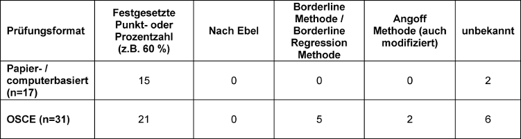 In den 32 Studiengängen, in denen bestehensrelevante Prüfungen für kommunikative Kompetenzen durchgeführt wurden, wurden für die Festlegung der Bestehensgrenze überwiegend normorientierte Verfahren [36] angewendet (z.B. eine festgelegte Prozentzahl von 60%). Kriteriumsorientierte Verfahren [36] kamen nur bei OSCEs zur Anwendung. Die angewandten Verfahren für die papier- und computerbasierten Prüfungen und die OSCEs sind in Tabelle 10 [Tab. 10] dargestellt. Für WBA wurden keine Verfahren angegeben.