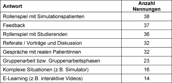 Am häufigsten wurden im Unterricht Rollenspiele mit Simulationspatienten (SP) (n=38) und Feedback (n=37) eingesetzt. Die genaue Auflistung der eingesetzten Unterrichtsmethoden ist in Tabelle 4 [Tab. 4] dargestellt. In den offenen Kommentaren wurden außerdem Gespräche mit Vertretern von Selbsthilfegruppen und Videofeedback angegeben.