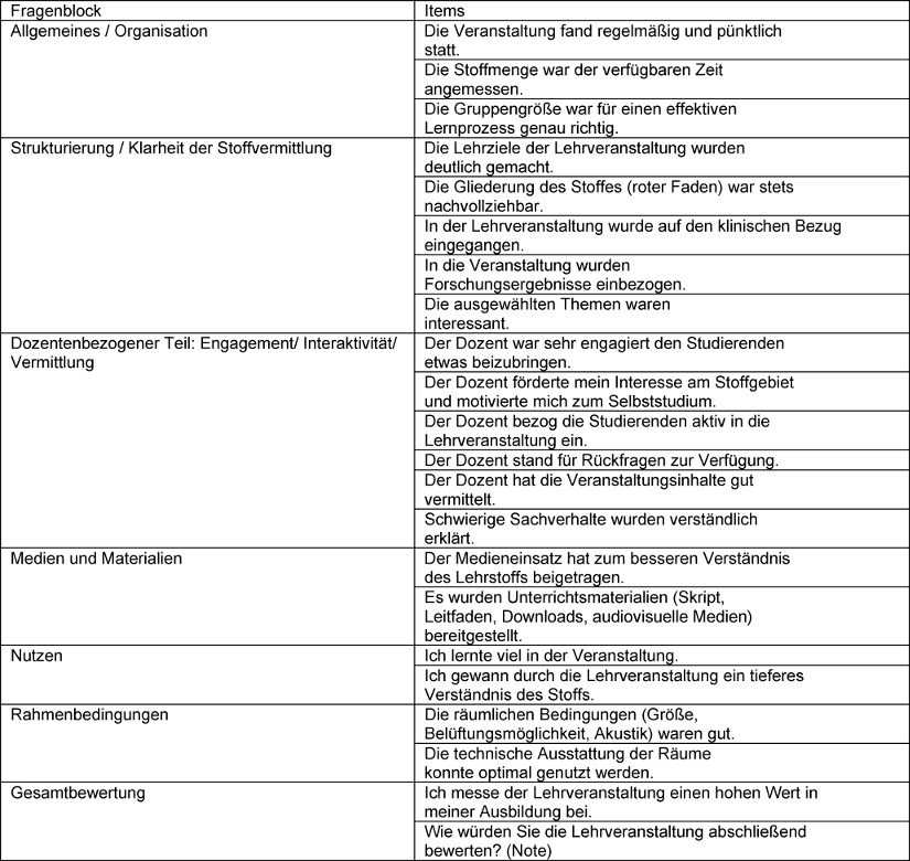 Zu Beginn wurden allgemeine Angaben zum Geschlecht und der Zeitaufwand zur Vor- und Nachbereitung der Veranstaltung pro Woche erfragt (bis zu 30 min, 30-59 min, 60-120 min, mehr als 120 min). In dem ersten Fragenblock „Allgemeines/Organisation“ wurde evaluiert, ob die Lehrveranstaltung regelmäßig und pünktlich stattfand, ob die anleitenden Dozenten ausreichend Zeit für die Ausbildung hatten und ob die Gruppengröße für einen effektiven Lernprozess genau richtig war. Danach folgten der zweite Fragenblock zu „Strukturierung/Klarheit der Stoffvermittlung“ und der dritte Fragenblock zum Dozentenbezogenen Teil „Engagement/Interaktivität/Vermittlung“. Im vierten Fragenblock „Medien und Materialien“ wurde gefragt, ob der Medieneinsatz zum besseren Verständnis des Lehrstoffes beigetragen hat und ob Unterrichtsmaterialien (Skripte) bereitgestellt wurden. Im fünften Block wurde der „Nutzen“ evaluiert. Danach wurden „Rahmenbedingen“ zu den Räumlichkeiten und zur technischen Ausstattung der Räume befragt. Am Ende des Fragebogens erfolgte die „Gesamtbewertung“ mit den Items „Ich messe der Lehrveranstaltung einen hohen Wert in meiner Ausbildung bei“ und „Wie würden Sie die Lehrveranstaltung abschließend bewerten?“ (siehe Tabelle 2 [Tab. 2]).