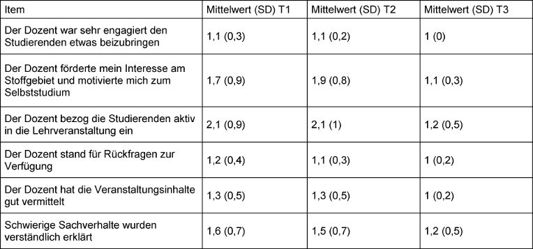 Die Items zu „Strukturierung / Klarheit der Stoffvermittlung“ sind in der Tabelle 3 [Tab. 3] aufgeführt. Zum Zeitpunkt T1 wurde das Item „in die Veranstaltung wurden Forschungsergebnisse einbezogen“ noch mit M=2,7 (SD=1,1) bewertet. Zu T2 fiel die Benotung mit M=1,5 (SD=0,8) und zu T3 mit M=1,8 (SD=1,1) aus. Die Tabelle 4 [Tab. 4] gibt die Items des dozentenbezogenen Teils wieder. In allen Items konnte zum Zeitpunkt T3 eine deutliche Zunahme der Studierendenbewertung festgestellt werden. Zu T1 und T2 wurde das Item „Der Dozent bezog die Studierenden aktiv in die Lehrveranstaltung ein“ noch mittelwertig mit 2,1 (SD=0,9) benotet, zu T3 im Mittel mit der Note 1,2 (SD=0,5).