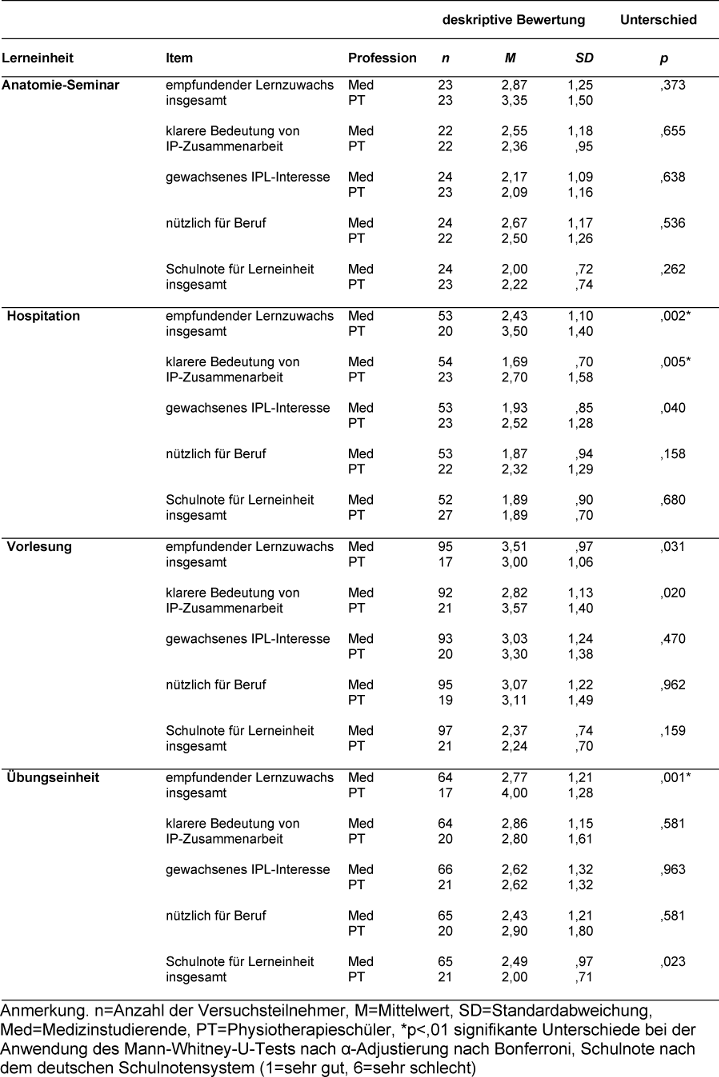 Signifikante Unterschiede zwischen Medizinstudierenden und Physiotherapieschülern gab es vorrangig beim empfundenen Lernzuwachs, den die Physiotherapieschüler als geringer angaben.