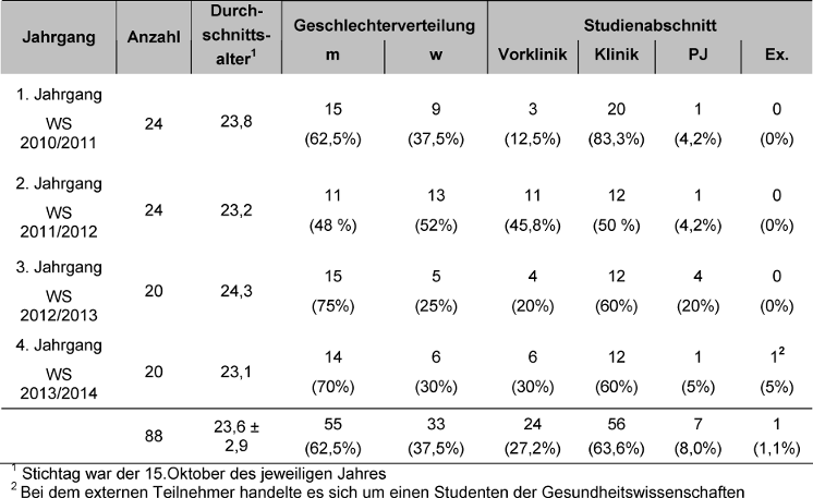 MeCuM-SiGma fand im Wintersemester 2014/2015 zum fünften Mal statt. In den vorherigen vier Jahrgängen (2010 - 2014) haben pro Kurs durchschnittlich 22 Studierende (insgesamt 88) teilgenommen. Das Durchschnittsalter aller Teilnehmer lag bei 23,6 (Mittelwert)±2,9 (Standardabweichung) Jahren, wobei es keine erheblichen Abweichungen zwischen den Jahrgängen (siehe Tabelle 4 [Tab. 4]) gab. 62,5 % aller Teilnehmer waren männlich, 37,5% weiblich. Hier zeigten sich allerdings Unterscheide zwischen den Jahrgängen (siehe Tabelle 4 [Tab. 4]). Etwa zwei Drittel der Teilnehmer (63,6%) befanden sich zum Zeitpunkt der Kursteilnahme im klinischen Studienabschnitt, ca. ein Viertel (27,1%) in der Vorklinik und der Rest im PJ (siehe Tabelle 4 [Tab. 4]). Ein Absolvent studierte nicht Humanmedizin.